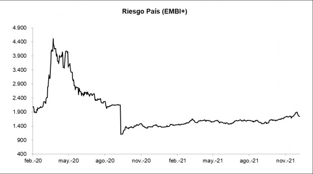 El riesgo país cerró en 1.738 puntos básicos al cierre del viernes, cayendo 33 puntos básicos respecto al día anterior. De esta manera, acumula una suba de 366 puntos en el año y de 634 puntos desde el canje de deuda soberana de septiembre de 2020.