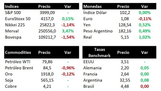 El índice de acciones S&P Merval registró un incremento del 3,5% al cierre de la jornada de ayer, acumulando un aumento de 24% en 2023. Por su parte, el índice medido en dólares tuvo un alza 3,2% en el día, acumulando una suba de 20,2% en el año.