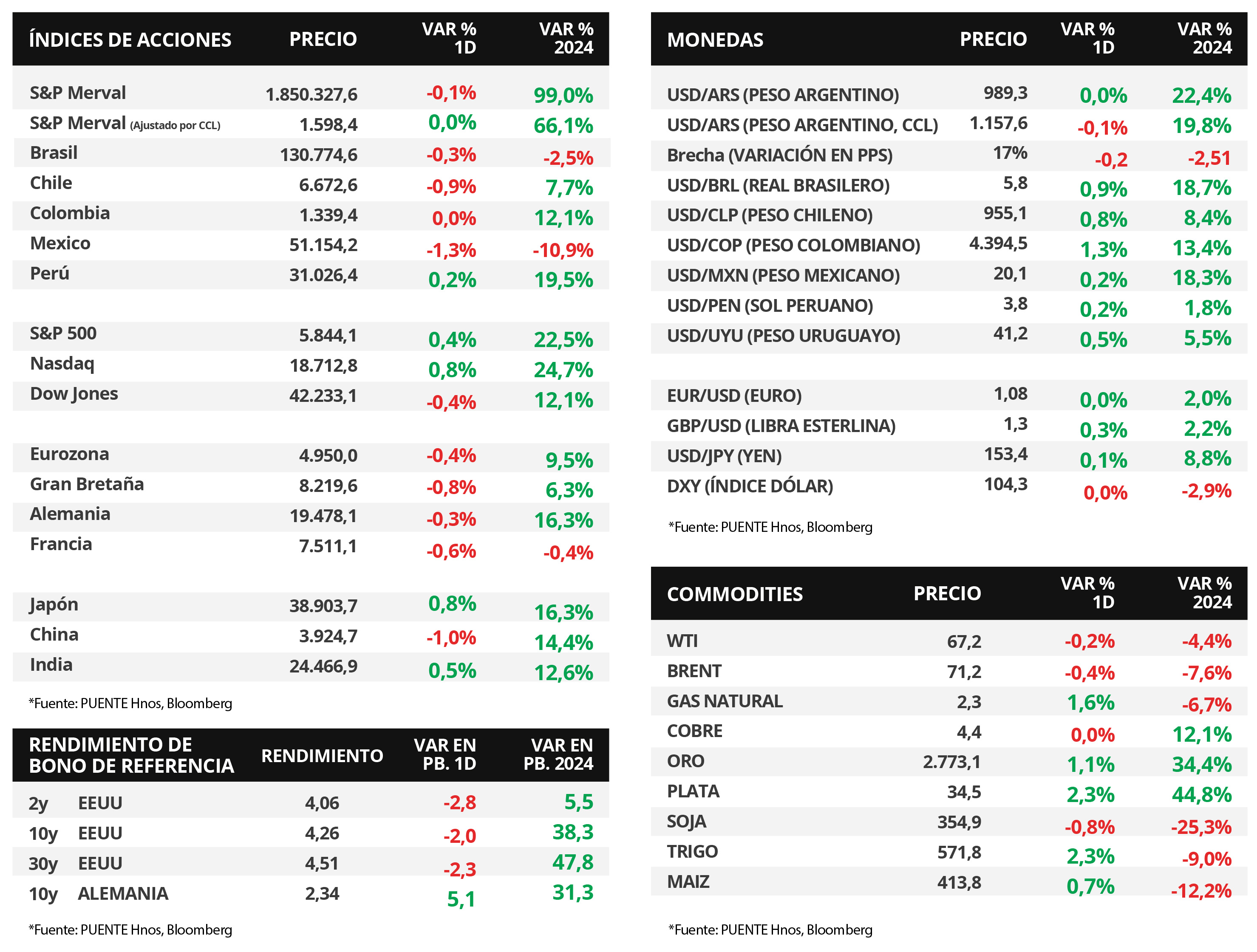 El índice de acciones S&P Merval exhibió una ligera merma del -0,1% al cierre del día martes, mientras que el índice medido en dólares no presentó cambios. Los sectores del panel líder presentaron variaciones mixtas, destacando Utilities y Energía con un avance del +2,8%
