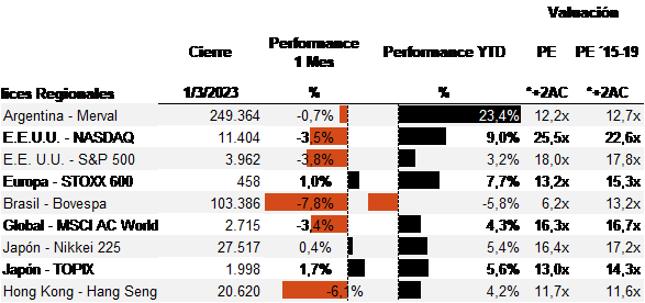 Todos estos factores alimentaron los temores de una inflación persistente en el corto plazo. La sorpresa del PCE (índice de gasto de consumo personal) de Estados Unidos acelerándose en una magnitud mayor a lo esperado empujó las tasas cortas a su nivel más alto en los últimos 16 años. El mercado descuenta tasas más altas por un tiempo más prolongado, asignándole una probabilidad del 25% a una suba de 50bps en la próxima reunión de la Fed el 21 y 22 de marzo. Cabe destacar que esta era inexistente apenas unas semanas atrás. De esta manera, los mercados accionarios revirtieron las ganancias del primer mes del año, cerrando febrero con rojos de entre 0,7% y 3,8%.