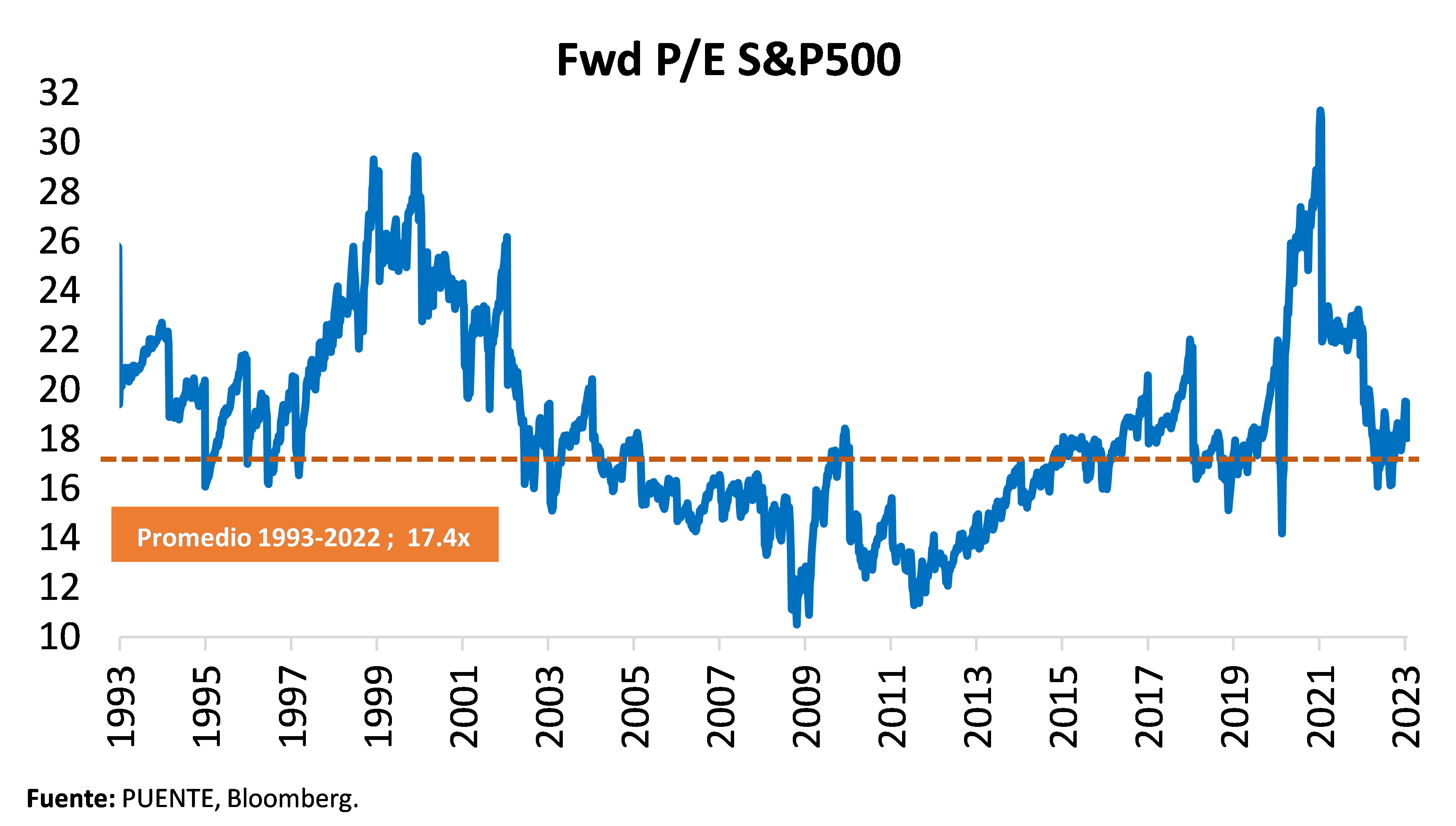 El Forward P/E del S&P 500 –es decir, el ratio precio/beneficio sobre las ganancias estimadas de los próximos 12 meses– alcanzó un nivel de 18,0x, por encima del promedio de 17,4x desde 1990. El Nasdaq, por su parte, había alcanzado un Fwd. P/E de 32x hace pocos días, y volvió a niveles de 25x después de la última corrección, en niveles promedio desde 2002.