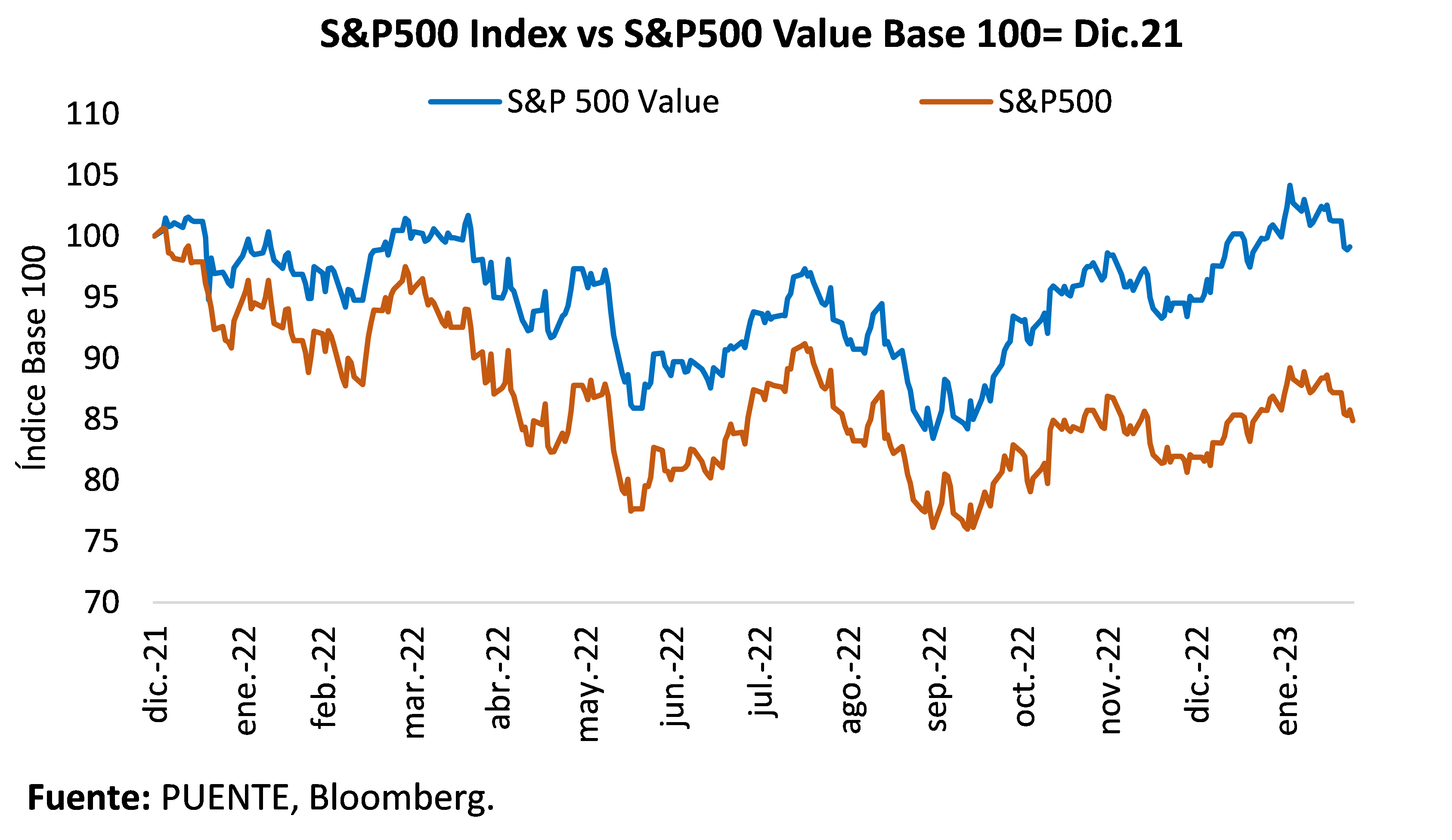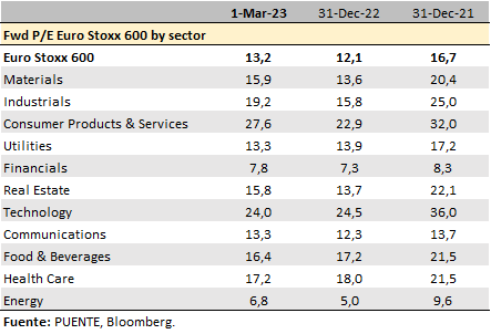 Además, creemos que el carácter value de la mayoría de las empresas europeas da lugar a una posible mejora relativa, sobre todo con respecto al sector growth más especulativo. Con respecto a sectores, las compañías energéticas forman parte del segmento value e incluso fueron las grandes impulsoras de la recuperación durante el 2022. Sin embargo, creemos que este año no será el sector que más tracción le dé a este segmento. Es probable que los sectores industrial y financiero sean más atractivos en este sentido. Dentro del financiero, nos mantenemos más cautelosos con respecto al subsector de Investment Banking dado el mayor costo de capital y de deuda, y considerando que el contexto macroeconómico no ayuda a negocios troncales como las operaciones de M&A (fusiones y adquisiciones).