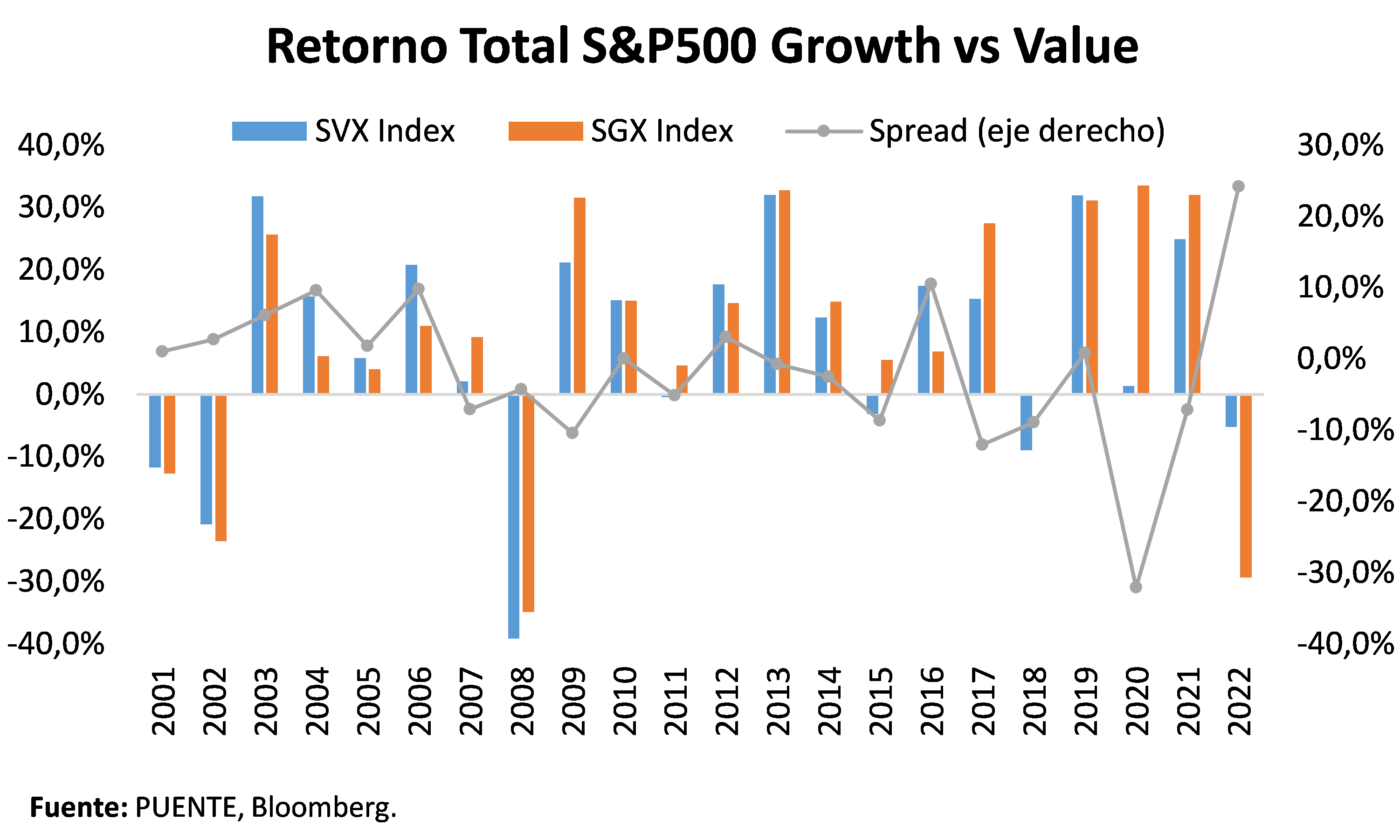Además, dado el contexto macroeconómico actual, preferimos ganar exposición a empresas con negocios sólidos, ventas poco volátiles y de crecimiento estable. Históricamente, estas compañías demostraron ser una jugada defensiva durante los años posteriores a los periodos de sobrecompra en papeles con fundamentos más débiles como fue la crisis del 2001. En los cinco años posteriores a la crisis de las puntocom, el segmento de acciones value superó a las growth en 5% por año en promedio.
