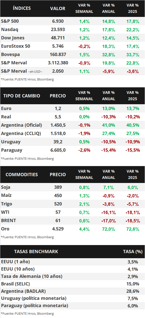 En Estados Unidos, la inflación de noviembre anotó un alza de +2,7% interanual y de +2,6% en la medición que excluye alimentos y combustibles (núcleo), resultando inferiores a las estimaciones del consenso de analistas (+3,1% y +3,0%, respectivamente). Cabe destacar que no hubo comparación mensual debido a la ausencia de datos del mes de octubre por el cierre parcial del Gobierno Federal. En lo que respecta al mercado laboral, se publicó información de los últimos dos meses: mientras que en octubre se perdieron -105 mil puestos de trabajo, en noviembre se crearon 64 mil puestos, por encima de los 50 mil estimados para dicho mes. A su vez, la tasa de desempleo se ubicó en 4,6% versus el 4,5% esperado.